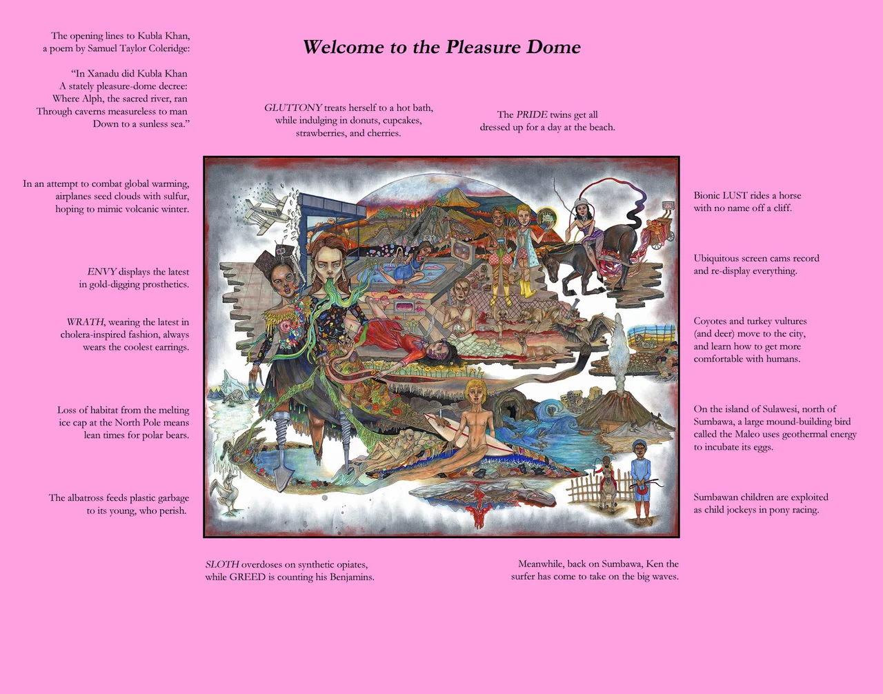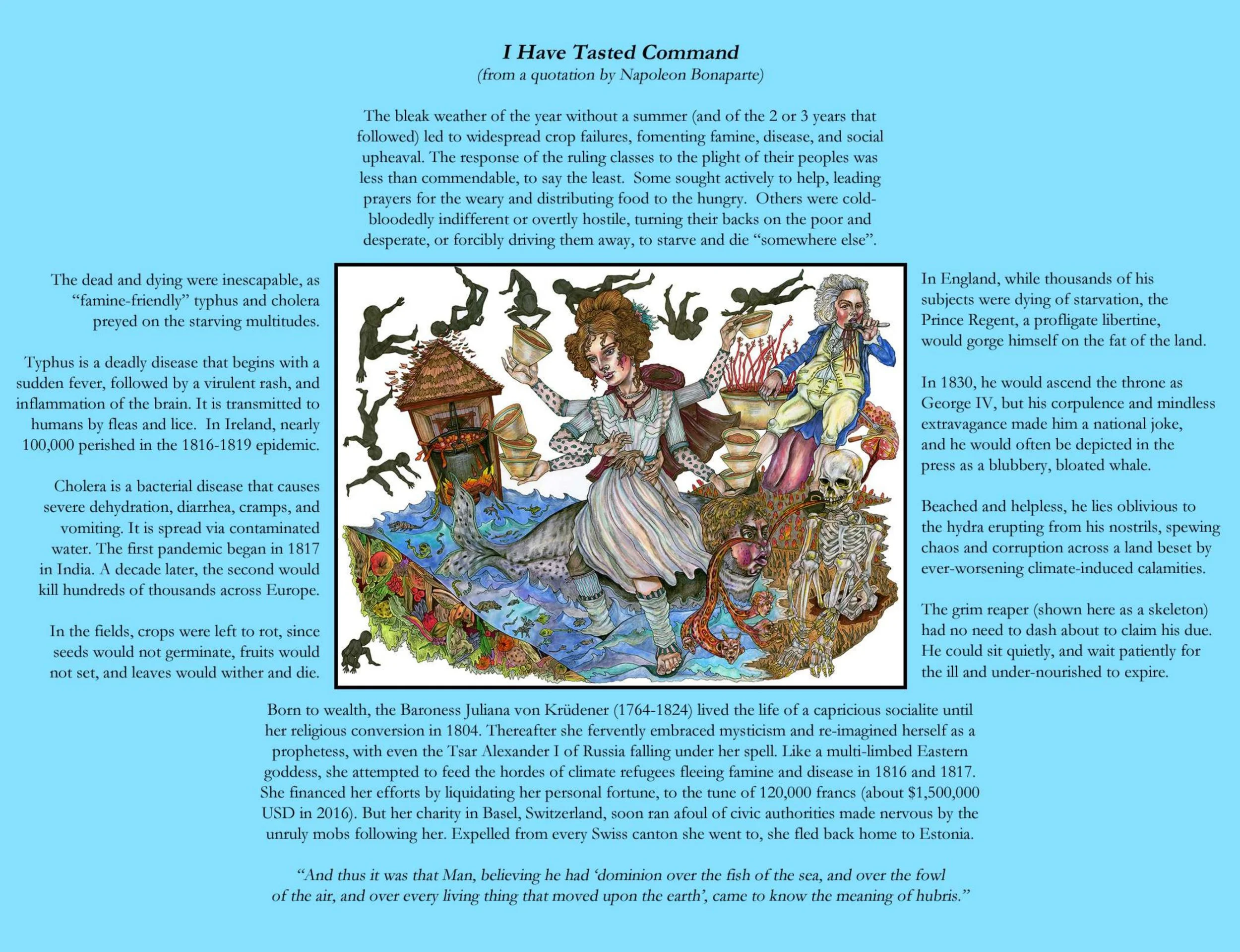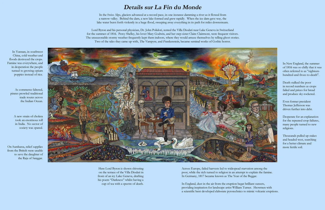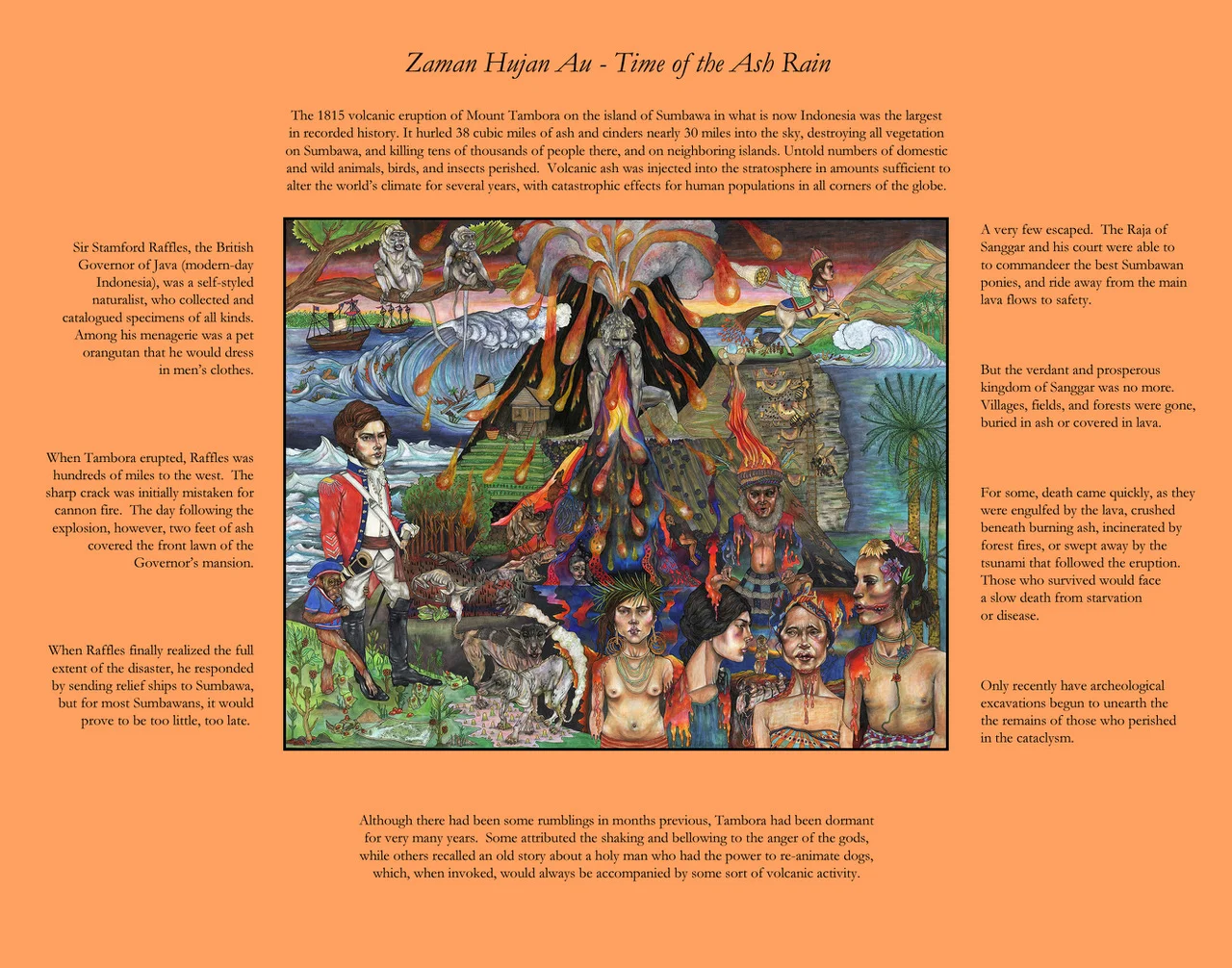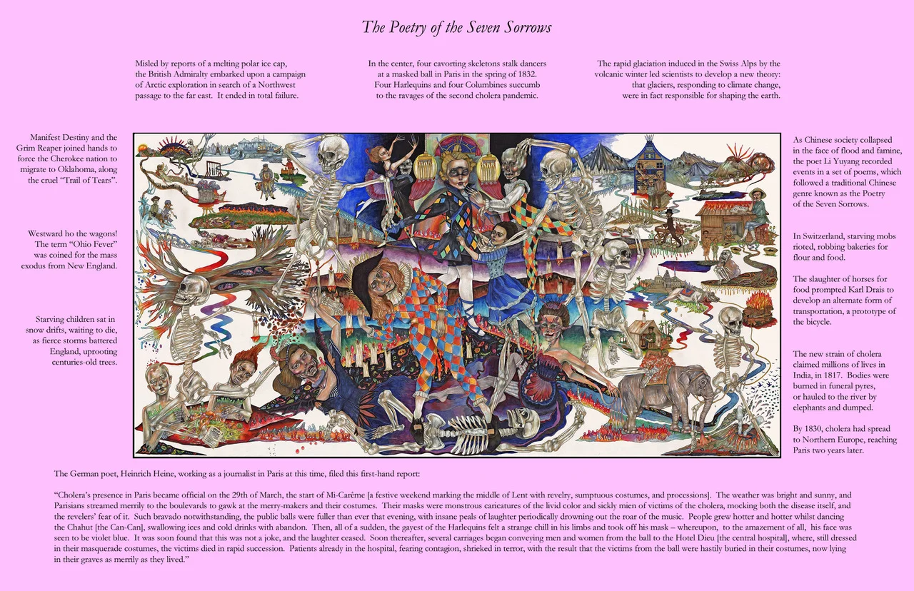 I created this series of stream-of-consciousness narrative drawings on the bicentennial of the year after the 1815 eruption of the volcano Tambora on the island of Sumbawa in present-day Indonesia. My fantastical works form a chronicle that bridges the catastrophe with the inspired global impact that followed. The series is a set of interrelated “surrealistic, symbolist, and fantastical” drawings that touch on the resulting worldwide crop failures, disease outbreaks, scientific discoveries and birth of literary Gothic Horror at Villa Diodati in Switzerland where Mary Shelley wrote Frankenstein. I depict “the dead and living” coming together to narrate a story with far-reaching cultural and social consequences. I populate her drawings with historical figures such as the painter J.M.W. Turner, whose luminous paintings may have been inspired by bizarre and eerie sunsets caused by the ash in the atmosphere; or founding father Benjamin Franklin, who was an early proponent of the idea that a volcanic eruption could affect global weather; and Thomas Jefferson, who advocated for the importance of accurate meteorological recordings. Also included are John James Audubon who, while painting birds, may have witnessed the decline of the passenger pigeon because of the large number of people left desperate for food; and the Royal families of Europe, whose response to the cataclysmic event was criticized for being disconnected and callous; and scholar turned farmer turned poet Li Yuyang, who resurrected the ancient Chinese poetry form called the “poetry of the seven sorrows” as a response to seeing his people in the Yunnan province starving and disease ridden as a result of the volcanic gasses; plus investigations into the further reaching aspects of the eruption, including Manifest Destiny (in the form of the Donner Party), and a satirical look at our present climate state as depicted through the seven deadly sins.