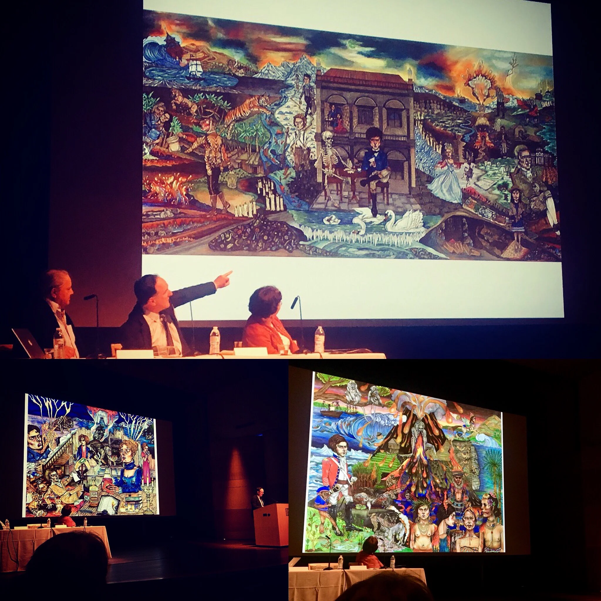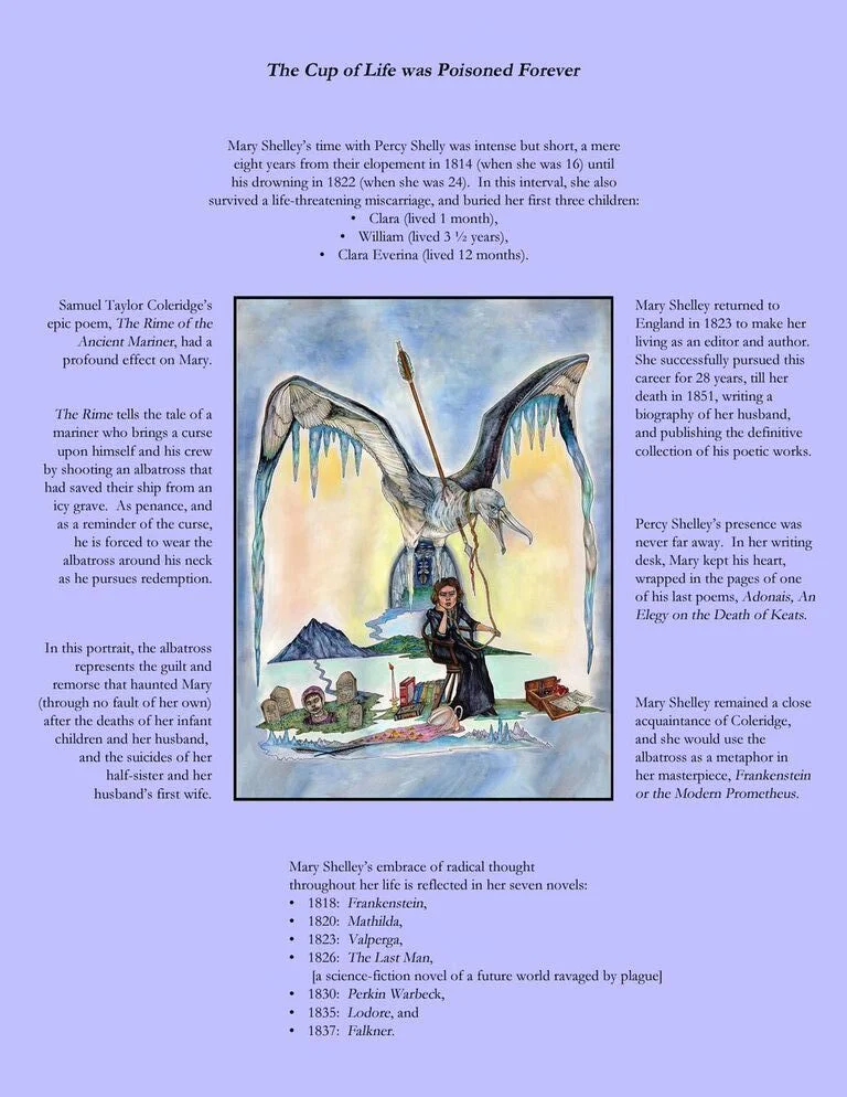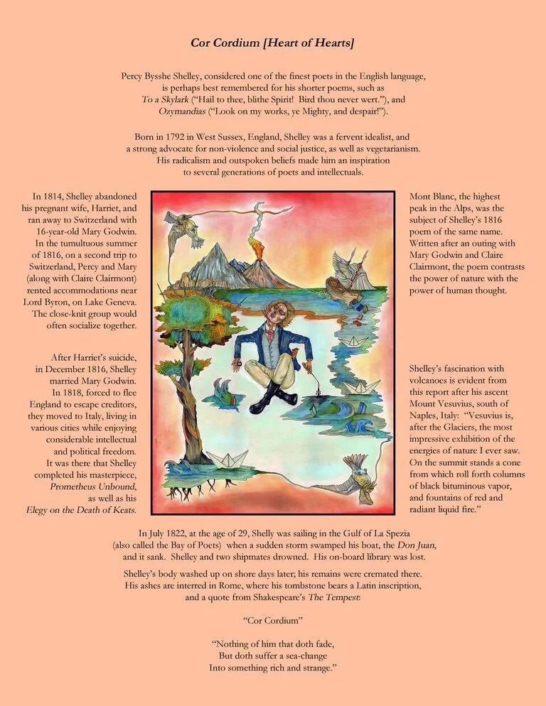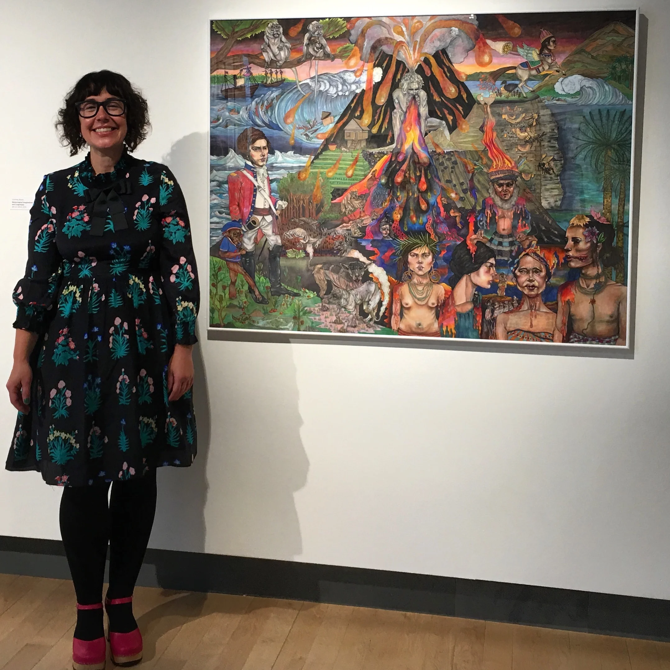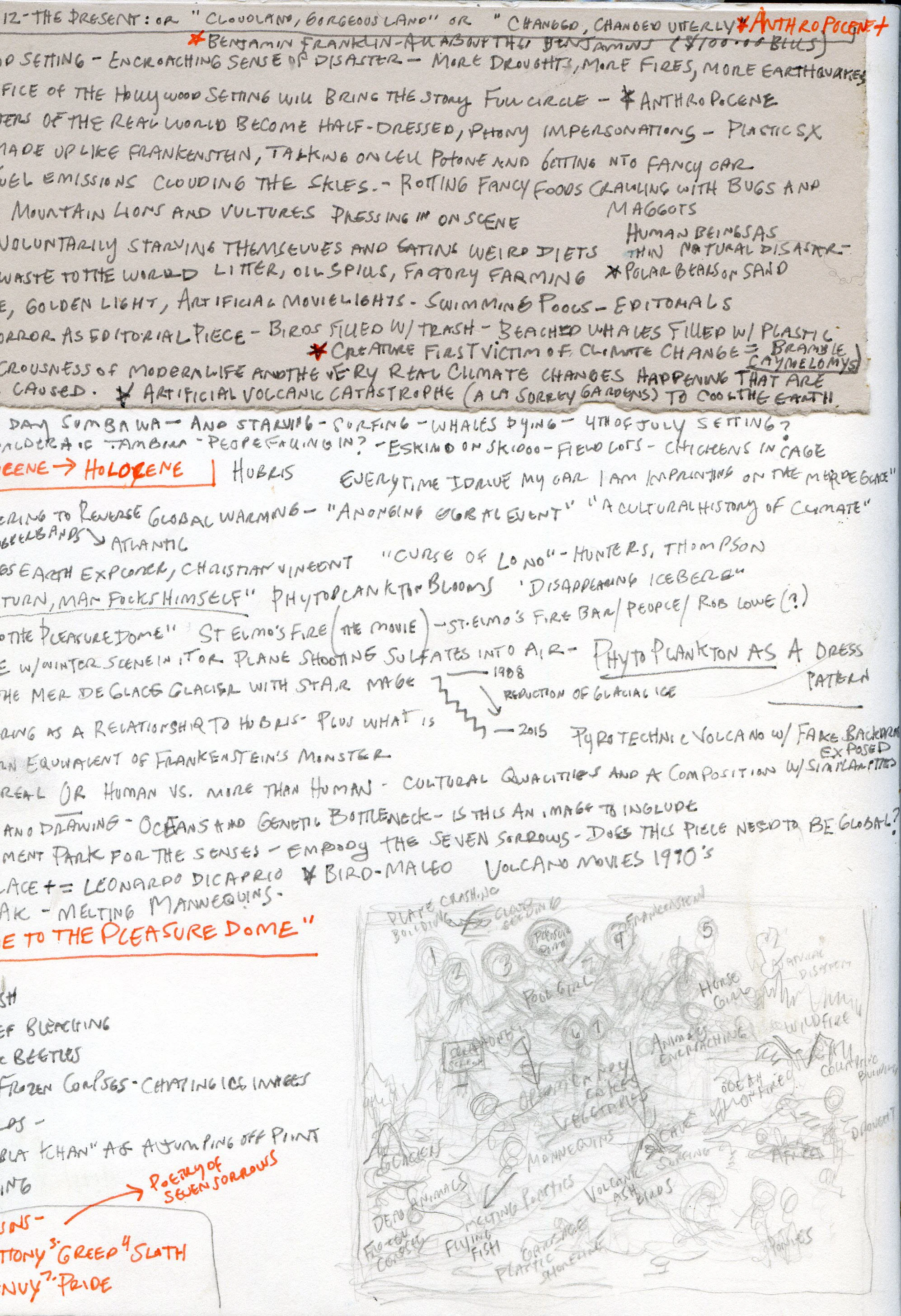 I created this series of stream-of-consciousness narrative drawings on the bicentennial of the year after the 1815 eruption of the volcano Tambora on the island of Sumbawa in present-day Indonesia. My fantastical works form a chronicle that bridges the catastrophe with the inspired global impact that followed. The series is a set of interrelated “surrealistic, symbolist, and fantastical” drawings that touch on the resulting worldwide crop failures, disease outbreaks, scientific discoveries and birth of literary Gothic Horror at Villa Diodati in Switzerland where Mary Shelley wrote Frankenstein. I depict “the dead and living” coming together to narrate a story with far-reaching cultural and social consequences. I populate her drawings with historical figures such as the painter J.M.W. Turner, whose luminous paintings may have been inspired by bizarre and eerie sunsets caused by the ash in the atmosphere; or founding father Benjamin Franklin, who was an early proponent of the idea that a volcanic eruption could affect global weather; and Thomas Jefferson, who advocated for the importance of accurate meteorological recordings. Also included are John James Audubon who, while painting birds, may have witnessed the decline of the passenger pigeon because of the large number of people left desperate for food; and the Royal families of Europe, whose response to the cataclysmic event was criticized for being disconnected and callous; and scholar turned farmer turned poet Li Yuyang, who resurrected the ancient Chinese poetry form called the “poetry of the seven sorrows” as a response to seeing his people in the Yunnan province starving and disease ridden as a result of the volcanic gasses; plus investigations into the further reaching aspects of the eruption, including Manifest Destiny (in the form of the Donner Party), and a satirical look at our present climate state as depicted through the seven deadly sins.