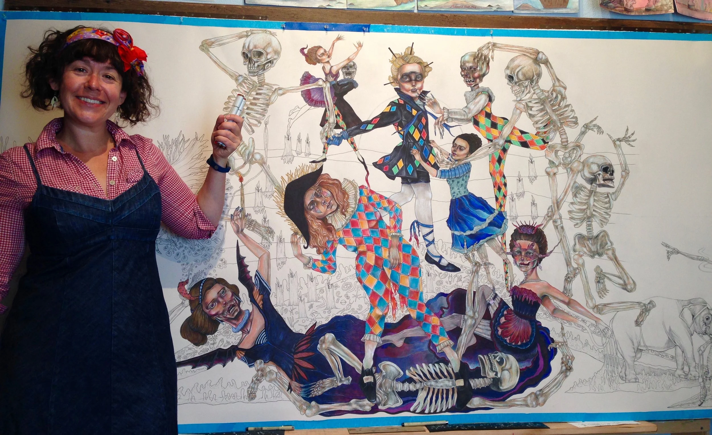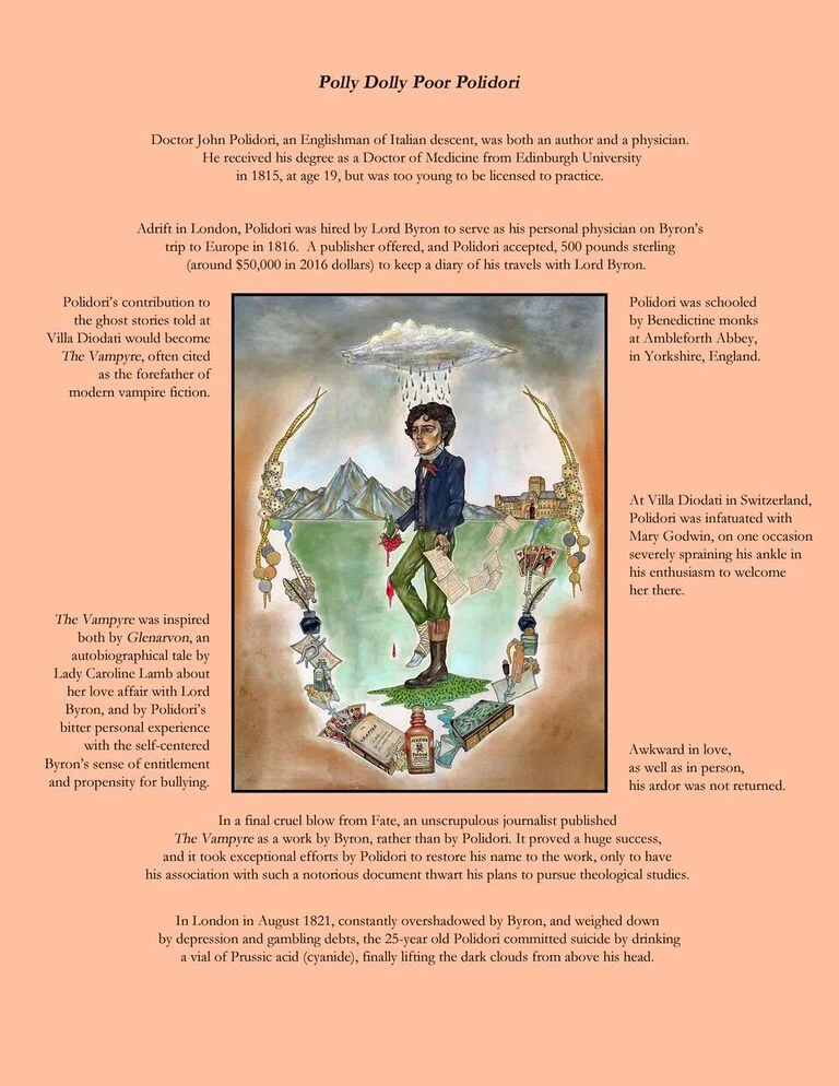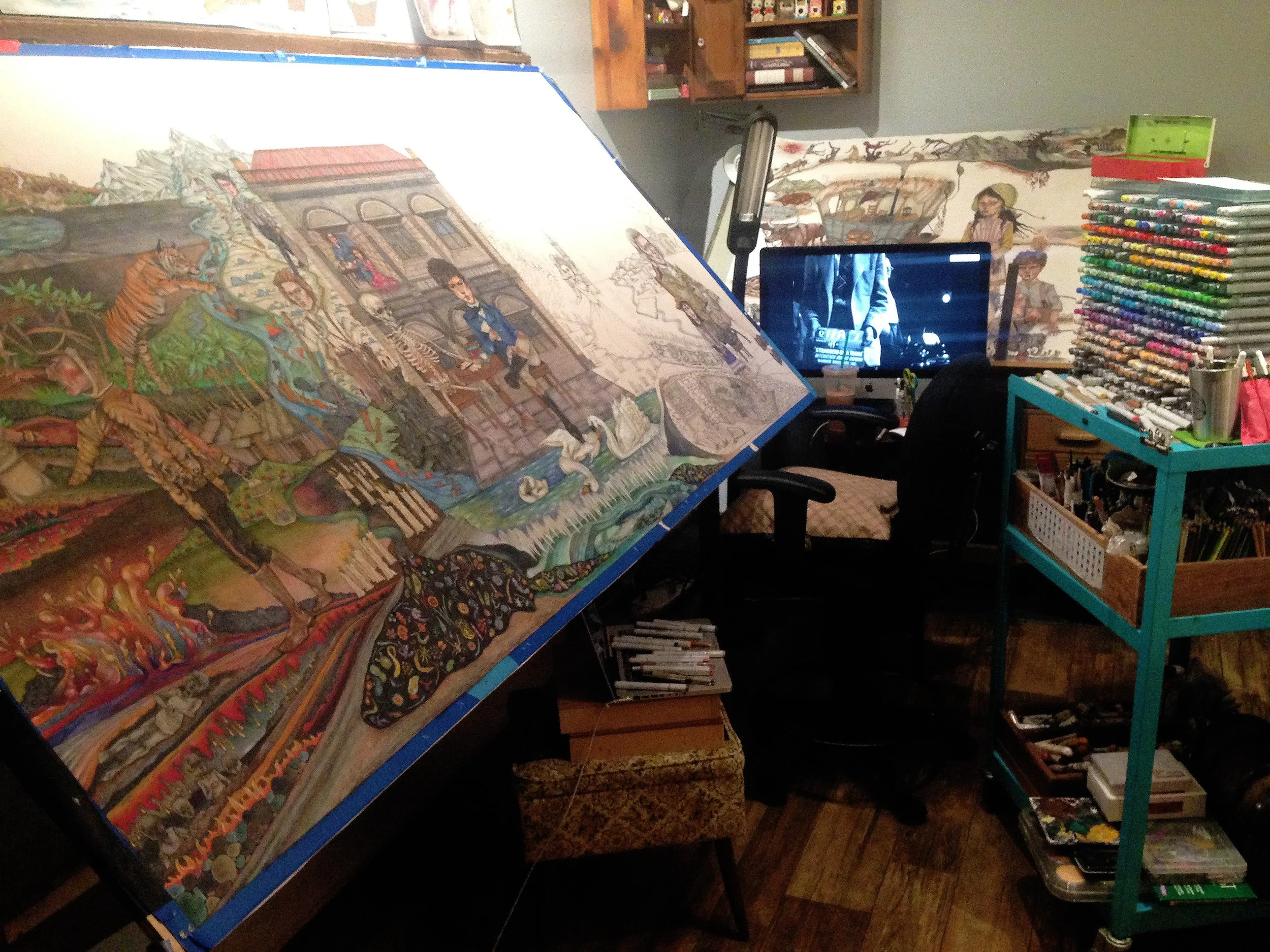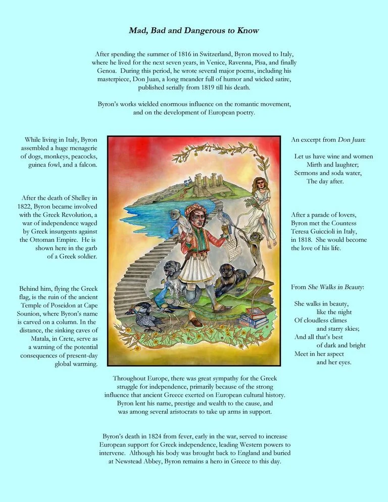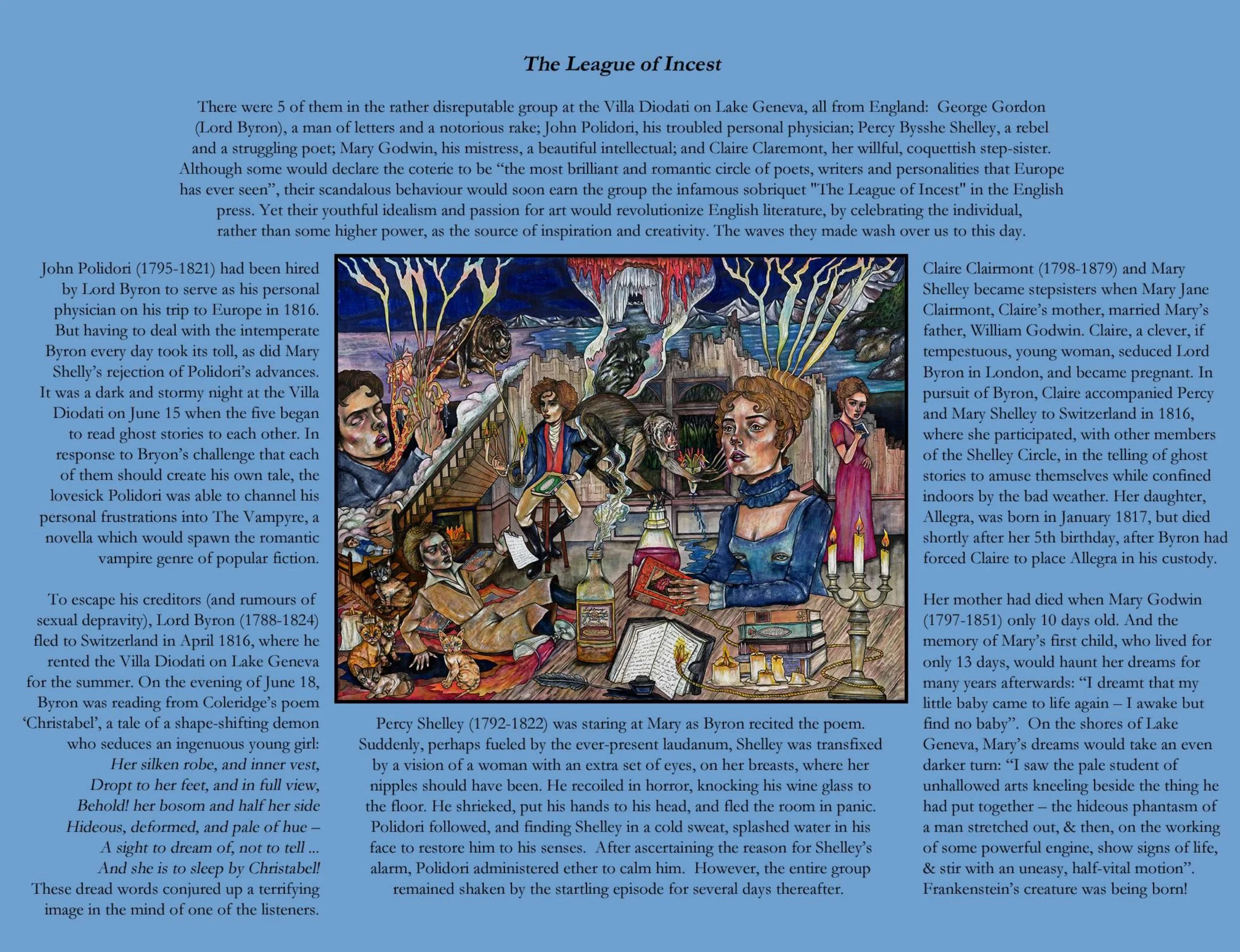 I created this series of stream-of-consciousness narrative drawings on the bicentennial of the year after the 1815 eruption of the volcano Tambora on the island of Sumbawa in present-day Indonesia. My fantastical works form a chronicle that bridges the catastrophe with the inspired global impact that followed. The series is a set of interrelated “surrealistic, symbolist, and fantastical” drawings that touch on the resulting worldwide crop failures, disease outbreaks, scientific discoveries and birth of literary Gothic Horror at Villa Diodati in Switzerland where Mary Shelley wrote Frankenstein. I depict “the dead and living” coming together to narrate a story with far-reaching cultural and social consequences. I populate her drawings with historical figures such as the painter J.M.W. Turner, whose luminous paintings may have been inspired by bizarre and eerie sunsets caused by the ash in the atmosphere; or founding father Benjamin Franklin, who was an early proponent of the idea that a volcanic eruption could affect global weather; and Thomas Jefferson, who advocated for the importance of accurate meteorological recordings. Also included are John James Audubon who, while painting birds, may have witnessed the decline of the passenger pigeon because of the large number of people left desperate for food; and the Royal families of Europe, whose response to the cataclysmic event was criticized for being disconnected and callous; and scholar turned farmer turned poet Li Yuyang, who resurrected the ancient Chinese poetry form called the “poetry of the seven sorrows” as a response to seeing his people in the Yunnan province starving and disease ridden as a result of the volcanic gasses; plus investigations into the further reaching aspects of the eruption, including Manifest Destiny (in the form of the Donner Party), and a satirical look at our present climate state as depicted through the seven deadly sins.