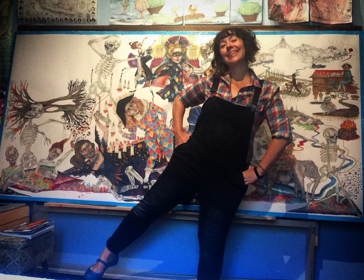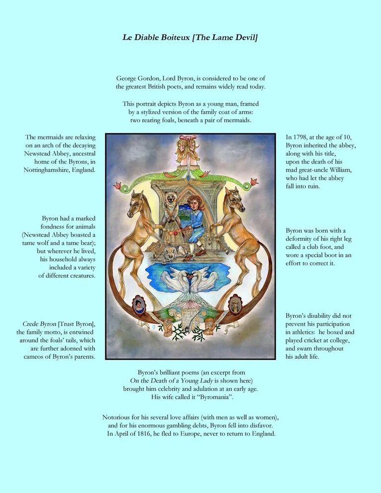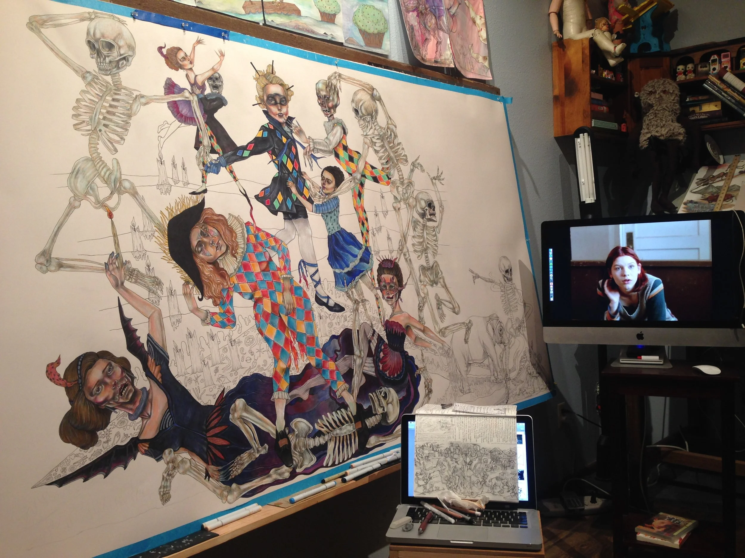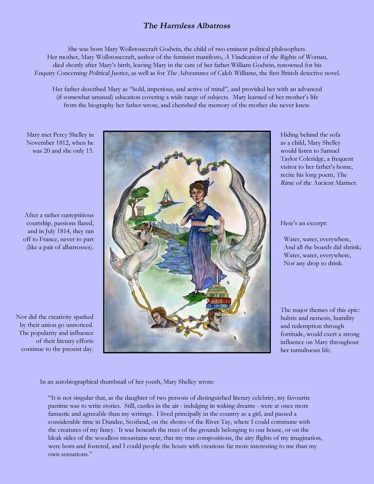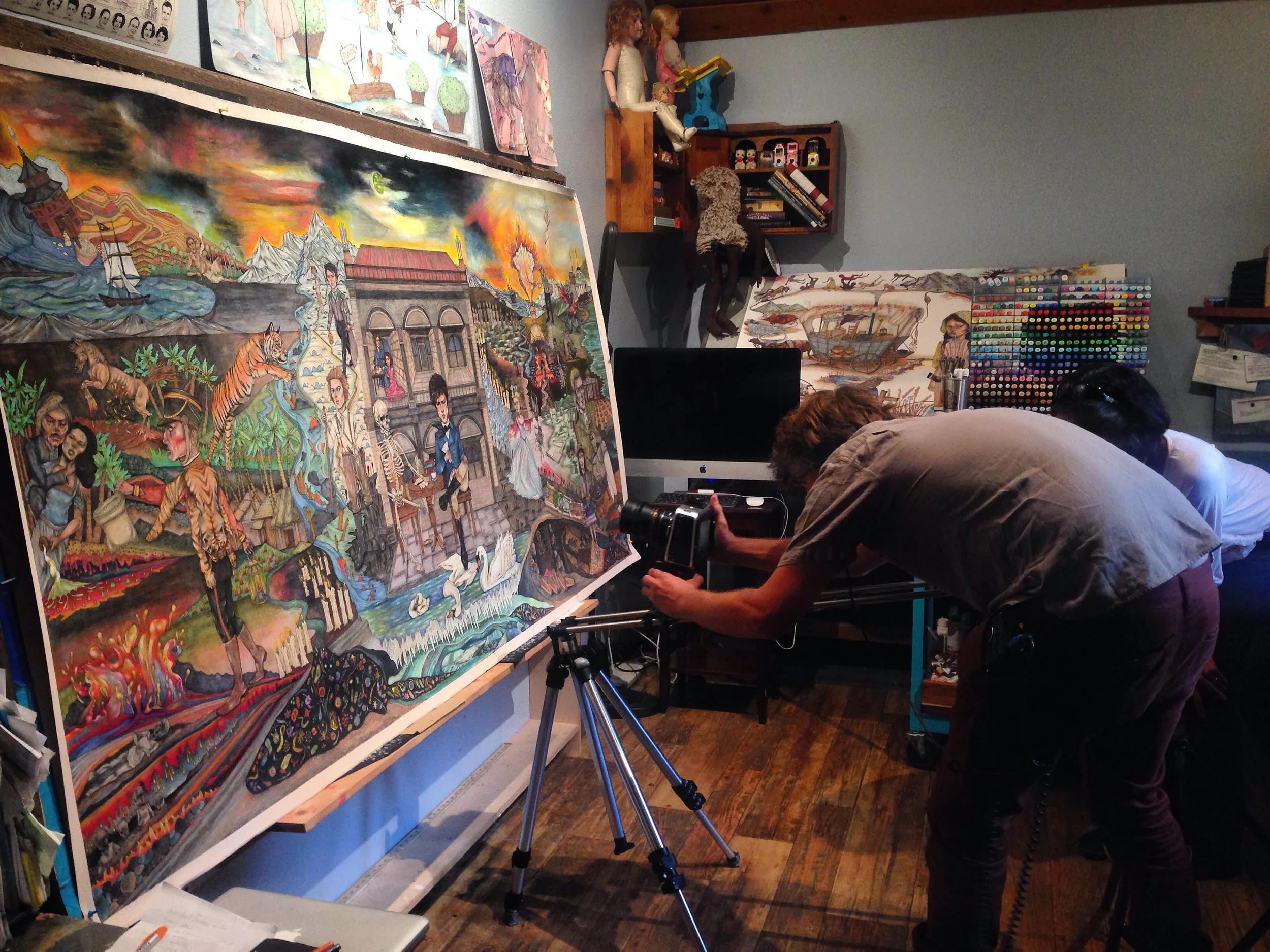 I created this series of stream-of-consciousness narrative drawings on the bicentennial of the year after the 1815 eruption of the volcano Tambora on the island of Sumbawa in present-day Indonesia. My fantastical works form a chronicle that bridges the catastrophe with the inspired global impact that followed. The series is a set of interrelated “surrealistic, symbolist, and fantastical” drawings that touch on the resulting worldwide crop failures, disease outbreaks, scientific discoveries and birth of literary Gothic Horror at Villa Diodati in Switzerland where Mary Shelley wrote Frankenstein. I depict “the dead and living” coming together to narrate a story with far-reaching cultural and social consequences. I populate her drawings with historical figures such as the painter J.M.W. Turner, whose luminous paintings may have been inspired by bizarre and eerie sunsets caused by the ash in the atmosphere; or founding father Benjamin Franklin, who was an early proponent of the idea that a volcanic eruption could affect global weather; and Thomas Jefferson, who advocated for the importance of accurate meteorological recordings. Also included are John James Audubon who, while painting birds, may have witnessed the decline of the passenger pigeon because of the large number of people left desperate for food; and the Royal families of Europe, whose response to the cataclysmic event was criticized for being disconnected and callous; and scholar turned farmer turned poet Li Yuyang, who resurrected the ancient Chinese poetry form called the “poetry of the seven sorrows” as a response to seeing his people in the Yunnan province starving and disease ridden as a result of the volcanic gasses; plus investigations into the further reaching aspects of the eruption, including Manifest Destiny (in the form of the Donner Party), and a satirical look at our present climate state as depicted through the seven deadly sins.