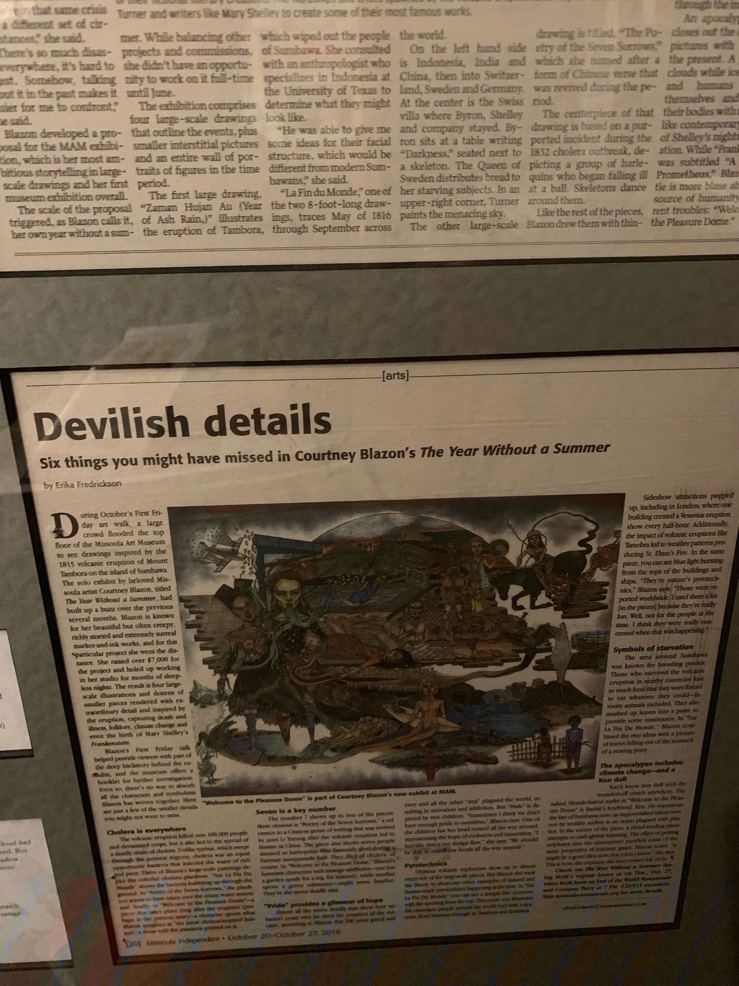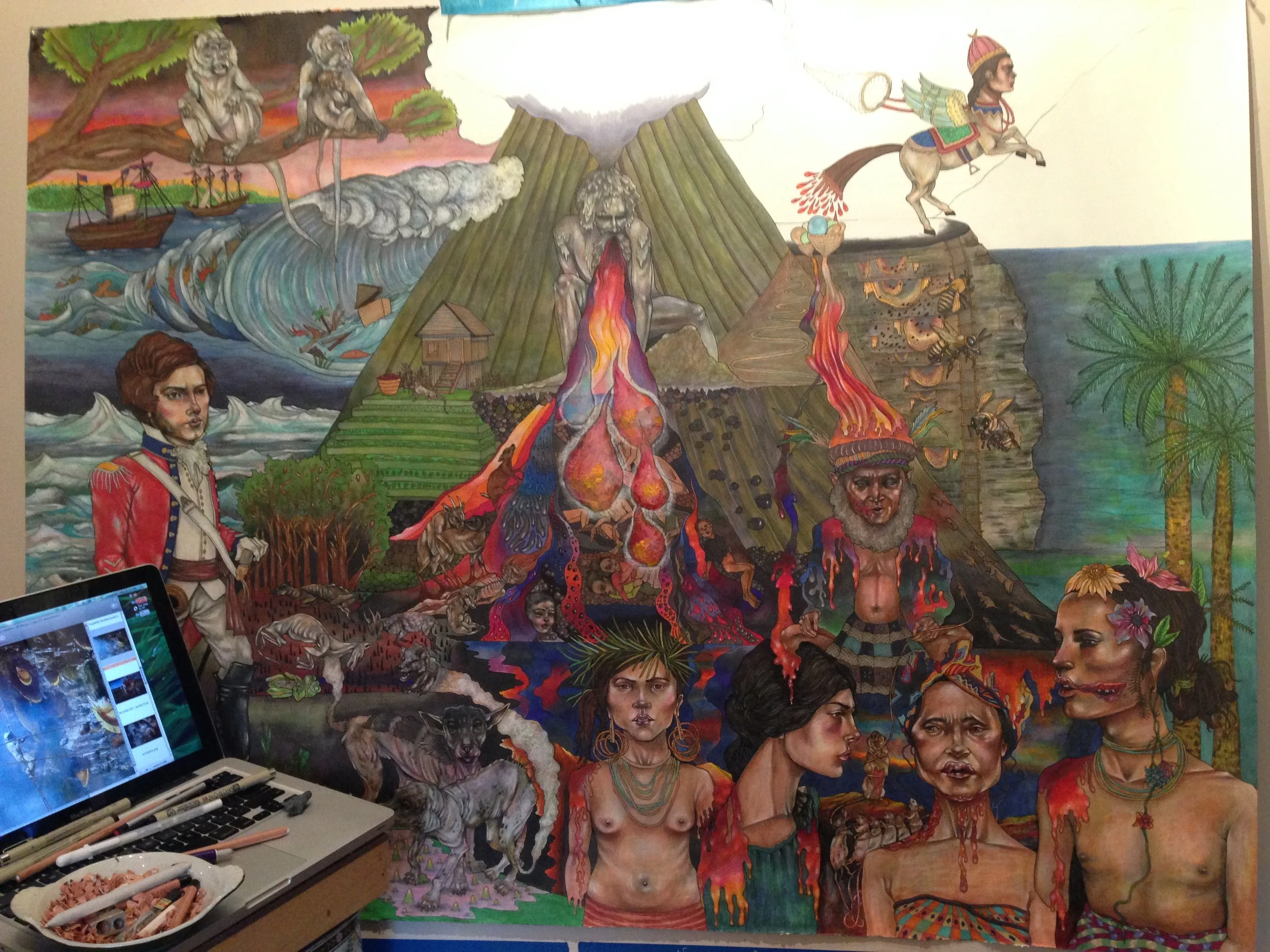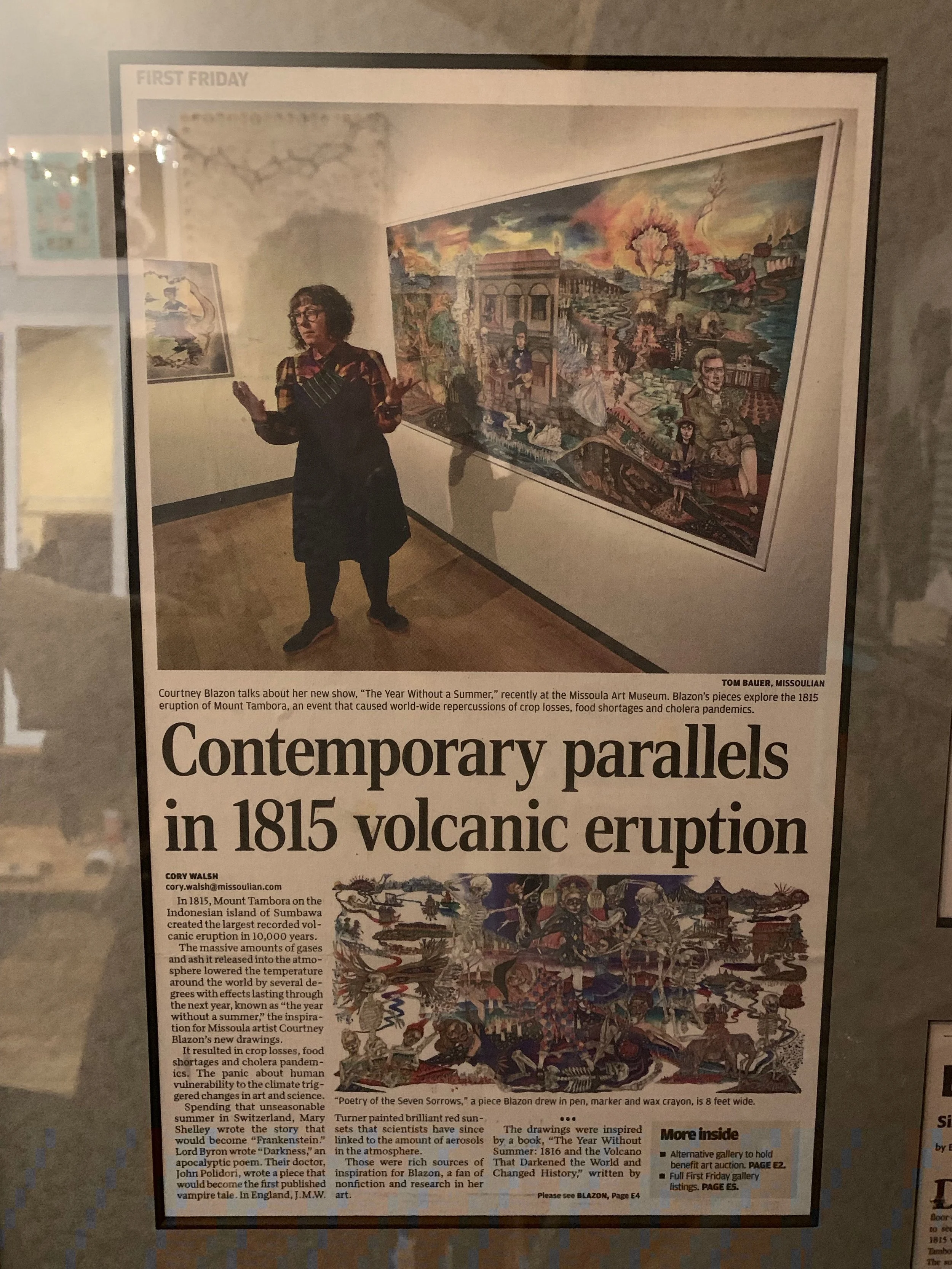 In April of 1815, the Volcano Tambora erupted on the island of Sumbawa in Indonesia, and is considered the 3rd largest volcanic eruption in recorded history. Aside from causing total devastation to the surrounding area, this eruption had global repercussions as volcanic gasses caused a worldwide aerosol cloud that clogged up the sky– in the year that followed, climate anomalies were recorded around the world. The volcanic winter and subsequent effects on European and North American crops caused 1816 to be known as the “Year Without A Summer.” This eruption gave rise to a whole host of events that spanned from the horrific and tragic to the literary and cultural. The birth of modern climate science, the birth of modern meteorology, the opening of the Northwest Passage, the advent of the Chinese opium trade, the birth of gothic horror and American westward expansion are just some of the amazing things that can be directly linked to the eruption of Volcano Tambora. These drawings link together the far-reaching effects of the eruption and demonstrate the global impact of this singular event, as well as making a connection to our current manmade climate state.