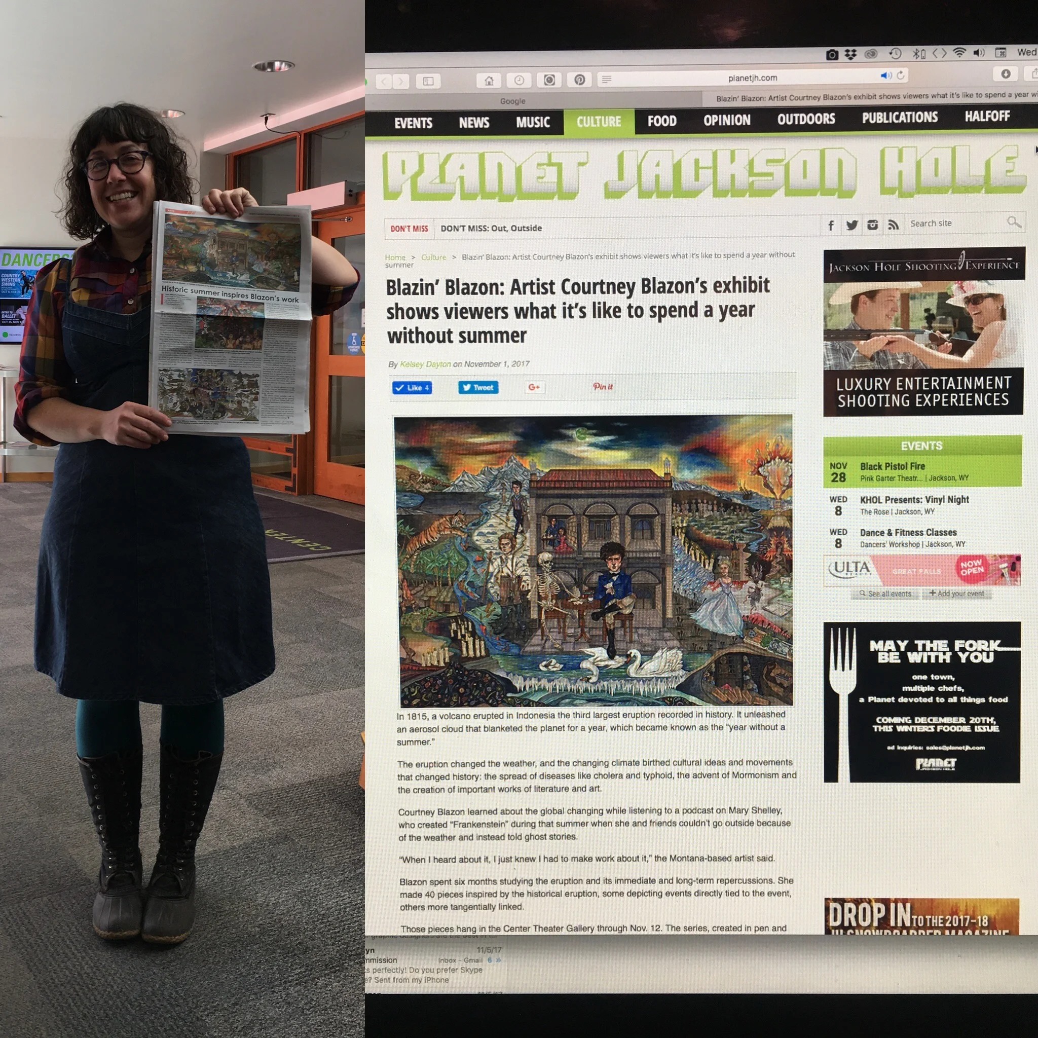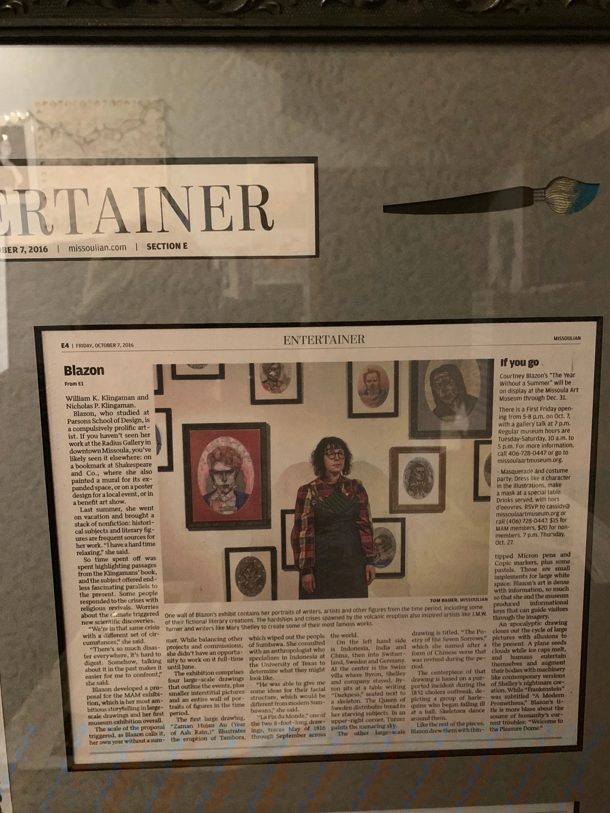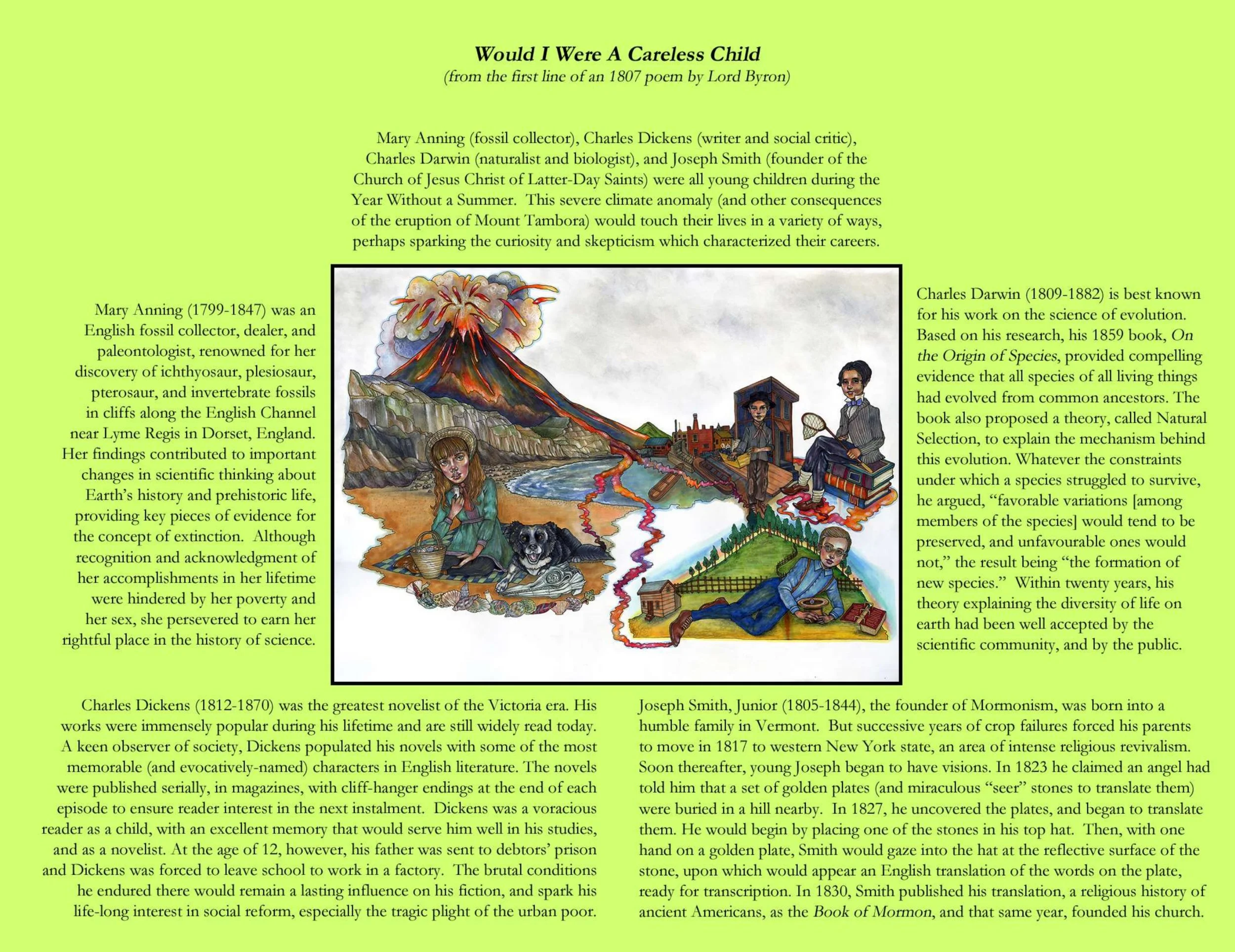 In April of 1815, the Volcano Tambora erupted on the island of Sumbawa in Indonesia, and is considered the 3rd largest volcanic eruption in recorded history. Aside from causing total devastation to the surrounding area, this eruption had global repercussions as volcanic gasses caused a worldwide aerosol cloud that clogged up the sky– in the year that followed, climate anomalies were recorded around the world. The volcanic winter and subsequent effects on European and North American crops caused 1816 to be known as the “Year Without A Summer.” This eruption gave rise to a whole host of events that spanned from the horrific and tragic to the literary and cultural. The birth of modern climate science, the birth of modern meteorology, the opening of the Northwest Passage, the advent of the Chinese opium trade, the birth of gothic horror and American westward expansion are just some of the amazing things that can be directly linked to the eruption of Volcano Tambora. These drawings link together the far-reaching effects of the eruption and demonstrate the global impact of this singular event, as well as making a connection to our current manmade climate state.